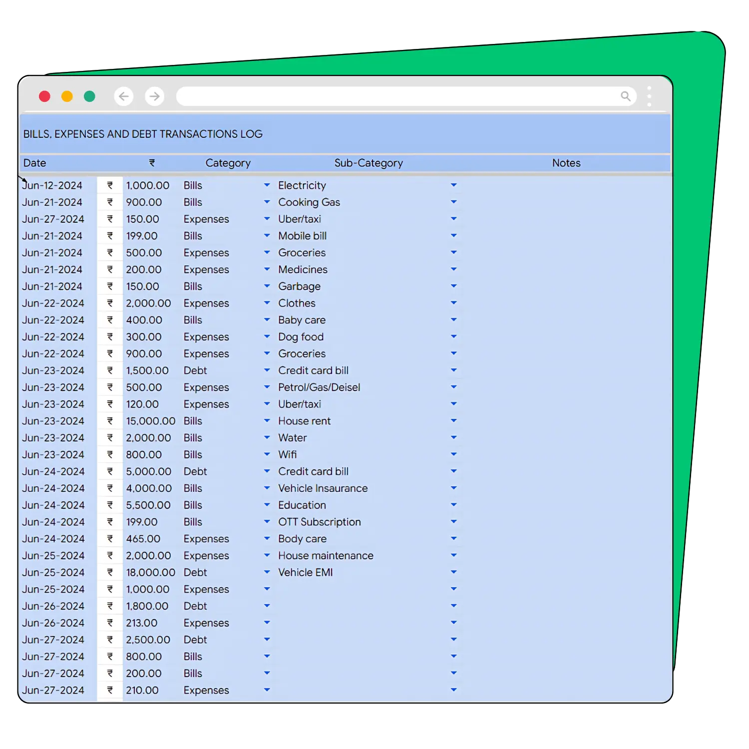 Use the Log Tab to record your actual bills, expenses, and debt transactions as you spend money. Enter the date, value, category, and sub-category of each transaction, and the spreadsheet will automatically update the main dashboard.