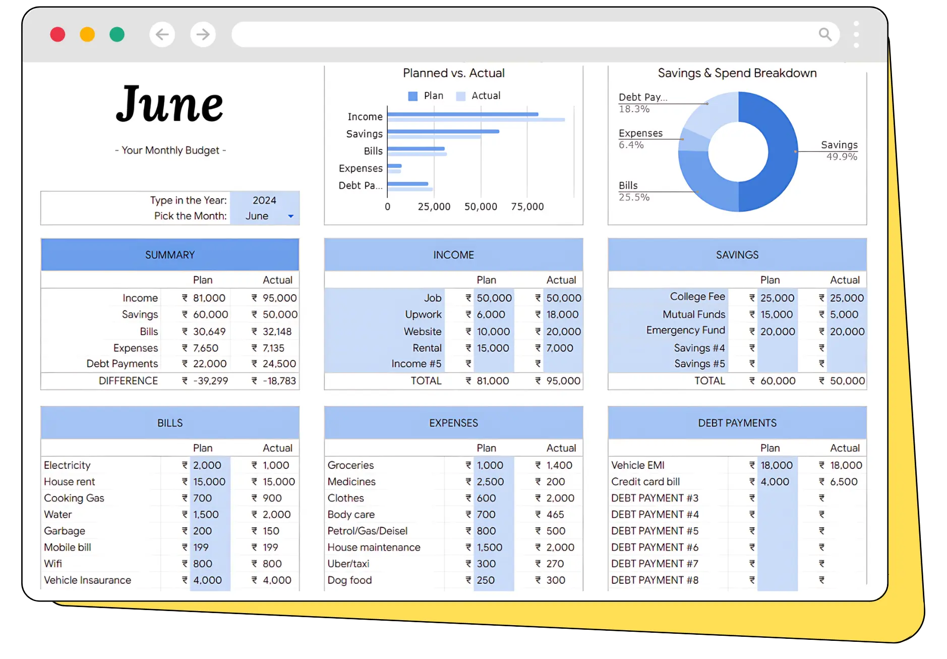 Our spreadsheet is designed to be flexible. You can add as many categories as you need, whether it's for additional bills, expenses, or debts. Every field is completely editable.